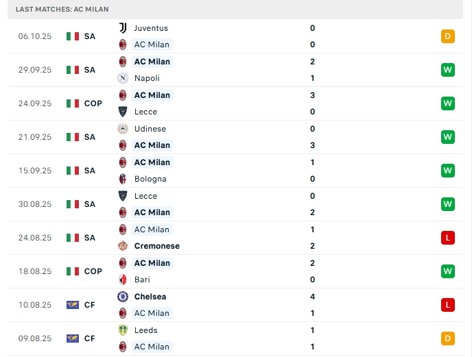 AC Milan ở 6 vòng đấu đầu tiên, họ mang về 4 chiến thắng, 1 hòa cùng 1 thất bại, họ có được 13 điểm và đang xếp vị trí 3 trên BXH, kém 2 điểm so với đội đang dẫn đầu là Napoli, ở trận gần nhất AC Milan có trận hòa trước Juventus, đây là trận bất bại thứ 6 liên tiếp trong đó có 5 chiến thắng, phong độ thời gian qua của AC Milan là tốt, đặc biệt trên sân nhà họ thắng 4 và chỉ thua 1 ở 5 trận gần nhất.