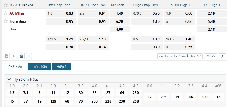 Bảng tỷ lệ kèo bóng đá trận đấu AC Milan vs Fiorentina