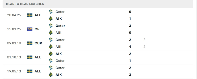 Những màn đụng độ giữa AIK Solna và Osters thường diễn ra hấp dẫn với nhiều bàn thắng được tạo ra, cụ thể ở 4/5 lần gặp nhau gần nhất của hai đội và 3/5 lần chạm đón tiếp Osters trên sân của AIK Solna khép lại từ 3 bàn trở lên.