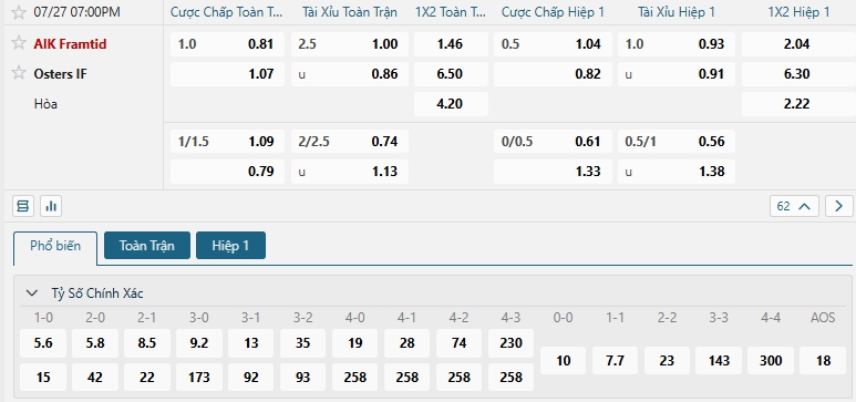 Bảng tỷ lệ kèo bóng đá trận đấu AIK Solna vs Osters