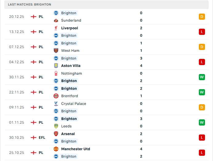 Brighton sau 17 lượt trận đầu tiên, hàng công của đội bóng này mang về 25 bàn thắng cùng hàng thủ nhận 23 bàn thua, 4/5 trận vừa qua của Brighton khép lại không quá 2 bàn thắng, khi thi đấu xa nhà ở 4/5 trận vừa qua cũng có kết quả tương tự, hàng thủ Brighton đang thi đấu cực kỳ chắc chắn.