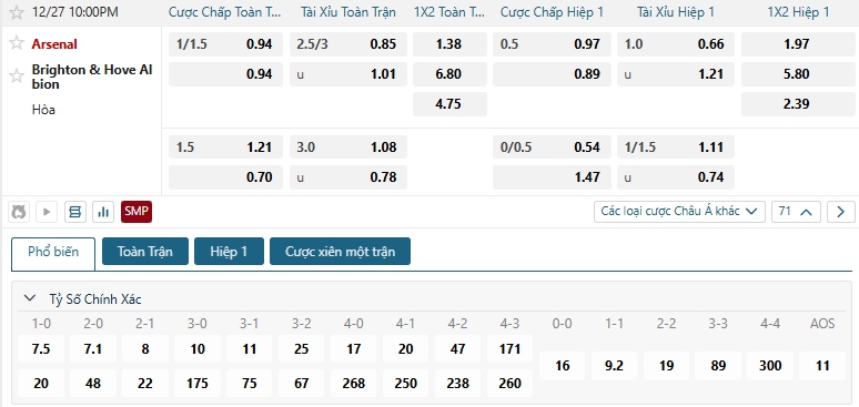 Bảng tỷ lệ kèo bóng đá trận đấu Arsenal vs Brighton