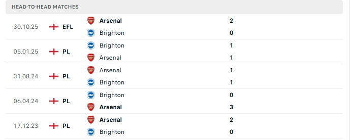 Phong độ gần đây Arsenal vs Brighton