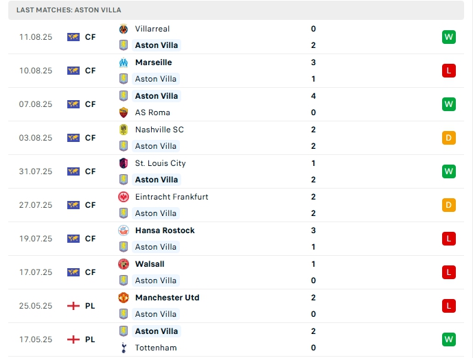 - Phong độ Aston Villa