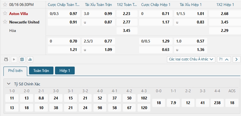 Nhà cái châu Á đang đánh giá cao khả năng chiến thắng của chủ nhà Aston Villa là cao hơn so với Newcastle, khi đưa ra mức chấp đang là 0.25, với ưu thế sân nhà, phong độ ấn tượng thời gian qua, ngược lại Newcastle đang chơi tệ thời gian qua và chưa tìm lại cảm giác chiến thắng thời gian dài, lựa chọn Aston Villa cho kèo châu Á.