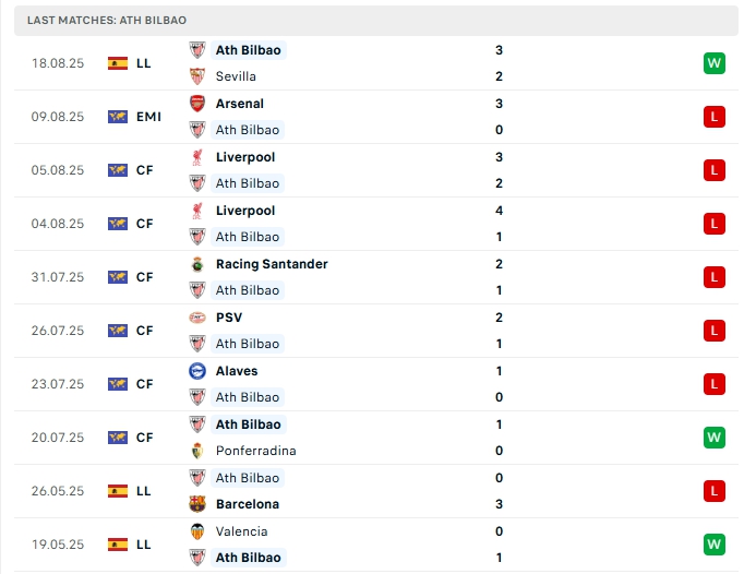 - Phong độ Athletic Bilbao