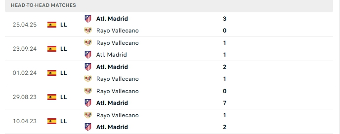 Lịch sử đối đầu của Atletico Madrid vs Rayo Vallecano