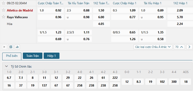 Bảng tỷ lệ kèo bóng đá trận đấu Atletico Madrid vs Rayo Vallecano