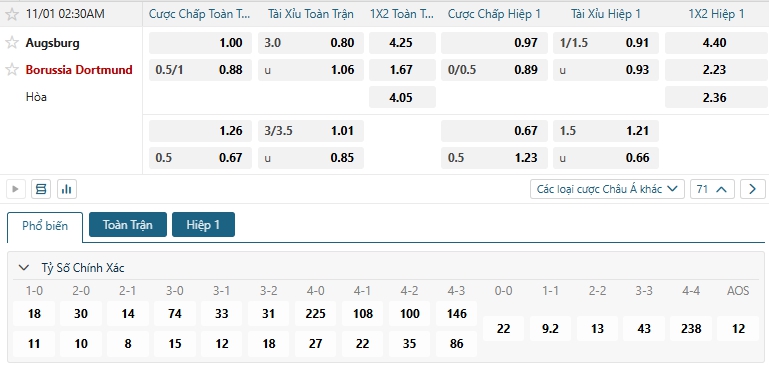 Bảng tỷ lệ kèo bóng đá trận đấu Augsburg vs Dortmund