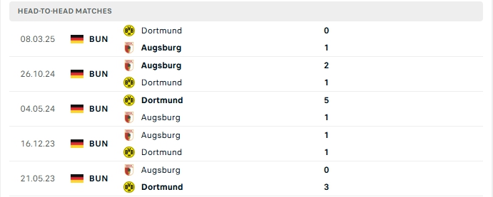 Lịch sử đối đầu của Augsburg vs Dortmund