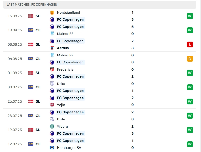 Copenhagen là đại diện đến từ Đan Mạch, đội bóng này sở hữu lối chơi tấn công đẹp mắt, 3/5 trận gần nhất của họ khép lại từ 3 bàn thắng trở lên, trong đó hàng công mang về 12 bàn thắng cùng hàng thủ nhận chỉ 4 bàn thua, 3/5 trận xa nhà của họ cũng có kết quả tương tự.