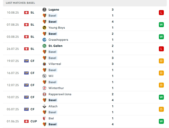 Basel là đại diện Thụy Sỹ, đội bóng này có lối chơi tấn công đẹp mắt, cả 5 trận vừa qua của họ khép lại 90 phút từ 3 bàn thắng trở lên, trong đó hàng công mang về 11 bàn thắng và hàng thủ nhận 10 bàn thua, 3/5 trận trên sân nhà của họ cũng khép lại vượt mốc 3 bàn.