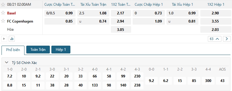 Bảng tỷ lệ kèo bóng đá trận đấu Basel vs Copenhagen