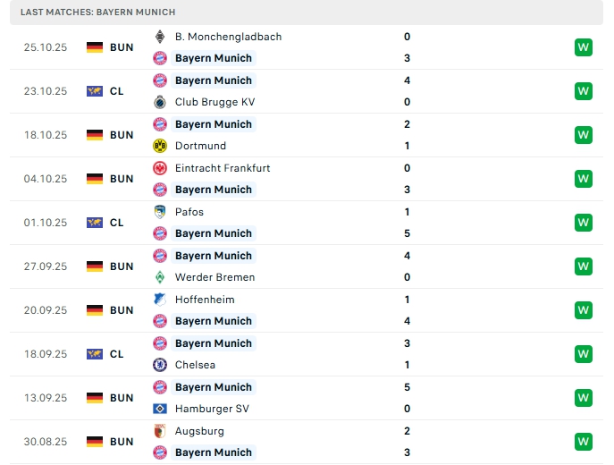 Bayern Munich sau 8 trận đấu, đội bóng này mang về 8 chiến thắng, có được 24 điểm và đang dẫn đầu trên BXH, họ tạo được khoảng cách 5 điểm nhiều hơn đối thủ xếp thứ 2 là Leipzig, phong độ thời gian qua của đoàn quân HLV Vincent Kompany là cực kỳ ấn tượng, họ thắng 16 trận liên tiếp, trên sân nhà của mình Hùm Xám cũng thắng 12 trận liên tiếp vừa qua.