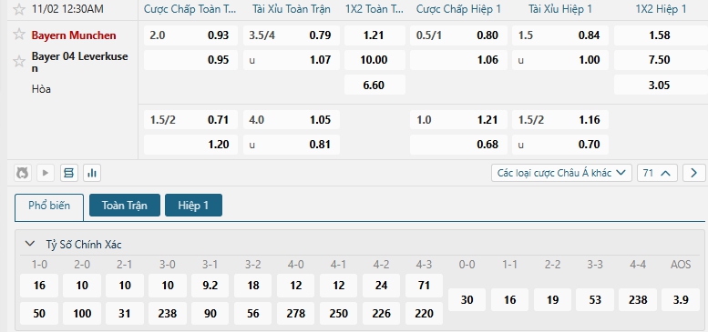 Nhà cái châu Á đang đánh giá cao khả năng chiến thắng của các cầu thủ chủ nhà Bayern Munich, khi đưa ra mức chấp đang là 2.0, Bayern Munich đang được đánh giá cao về thực lực, họ sở hữu lối chơi ấn tượng, chất lượng đội hình cùng với đó là ưu thế sân nhà, chắc chắn hùm xám sẻ hướng đến chiến thắng, thậm chí là chiến thắng đậm trước đối thủ, trong khi đó Bayer Leverkusen dù vẫn duy trì chuỗi phong độ tốt nhưng họ chắn chắn sẻ gặp khó và đối diện với nhiều thách thức trên sân của Bayern Munich, lựa chọn Bayern Munich cho kèo châu Á.