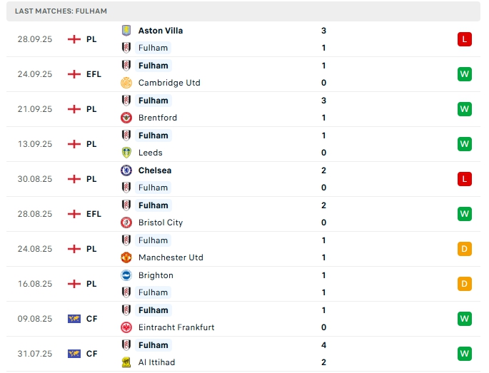 Bên kia sân, Fulham ở vòng đấu gần nhất họ nhận thất bại 1-3 trước Aston Villa, thất bại này chấm dứt chuỗi 3 chiến thắng liên tiếp trước đó, sau 6 trận đấu, Fulham mang về 2 chiến thắng, 2 hòa và 2 thất bại, có được 8 điểm và đang xếp vị trí thứ 11 trên BXH, phong độ thời gian qua của Fulham là khá tốt, họ thắng 3 và thua 1 ở 4 trận gần nhất, dù vậy khi thi đấu xa nhà Fulham lại đang chơi tệ khi chỉ có 1 chiến thắng, 1 hòa và nhận 3 thất bại sau 5 trận đấu.