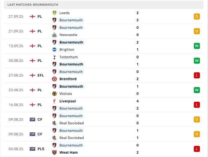 Bournemouth ở vòng đấu vừa qua họ có trận hòa 2-2 trước Leeds, trận hòa này nối dài chuỗi 4 trận liên tiếp bất bại với 2 chiến thắng và 2 hòa, sau 6 trận đấu Bournemouth có cho mình 3 chiến thắng, 2 hòa và 1 thất bại, có được 11 điểm và đang xếp vị trí thứ 6 trên BXH, phong độ thời gian qua của Bournemouth là khá tốt, trên sân nhà của mình Bournemouth có được 2 chiến thắng, 2 hòa sau 1 thất bại.