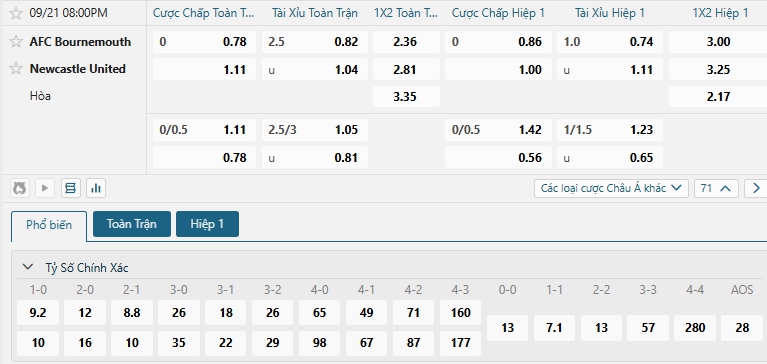 Nhà cái châu Âu đang đánh giá cao khả năng chiến thắng của hai đội là khá cân bằng, khi đưa ra mức tỷ lệ là 2.36 và các cầu thủ khách là 2.81, Bournemouth với những ưu thế đang có sẻ tự tin hướng đến kết quả tốt, trong khi Newcastle lại chơi tệ thời gian qua, lịch sử đối đầu cũng đang giúp Bournemouth tự tin, lựa chọn Bournemouth cho kèo châu Âu.