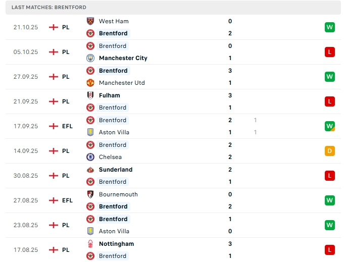 Brentford  sau 8 trận đấu họ mang về 3 chiến thắng, 1 hòa cùng 4 thất bại, có được 10 điểm và đang xếp vị trí thứ 13 trên BXH, ở vòng đấu gần nhất Bầy ong có được chiến thắng 2-0 trước West Ham, phong độ thời gian qua của Brentford là không quá tốt, đan xen với 1 thất bại là 1 chiến thắng, dù vậy trên sân nhà của mình Brentford đang chơi hay với 3 chiến thắng, 1 hòa và chỉ 1 thất bại ở 5 trận gần nhất.