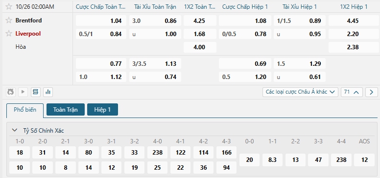 Bảng tỷ lệ kèo bóng đá trận đấu Brentford vs Liverpool