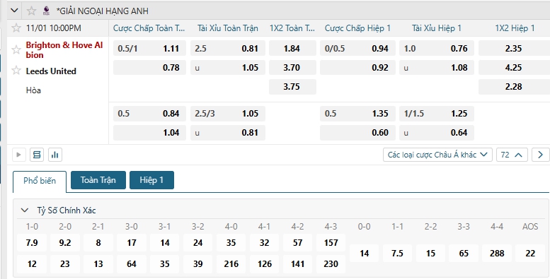Bảng tỷ lệ kèo bóng đá trận đấu Brighton vs Leeds Utd