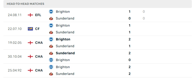 Lịch sử đối đầu của Brighton vs Sunderland
