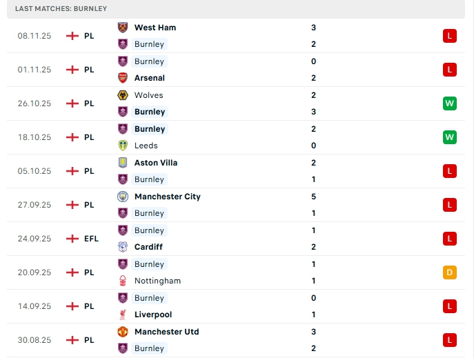 Burnley sau 11 trận đấu họ mang về 3 chiến thắng, 1 hòa cùng 7 thất bại, có được 10 điểm và đang xếp vị trí thứ 17 trên BXH, bằng điểm với đối thủ trong nhóm cầm đèn đỏ là West Ham, ở vòng đấu gần nhất Burnley nhận thất bại 2-3 trước West Ham, đây là thất bại thứ 2 liên tiếp của Burnley, phong độ thời gian qua của Burnley là không tốt, họ thua 3 và thắng 2 ở 5 trận gần nhất, trên sân nhà Burnley chỉ thắng 1, hòa 1 và thua 3 ở 5 trận vừa qua.