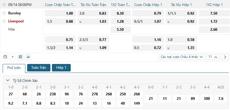 Bảng tỷ lệ kèo bóng đá trận đấu Burnley vs Liverpool
