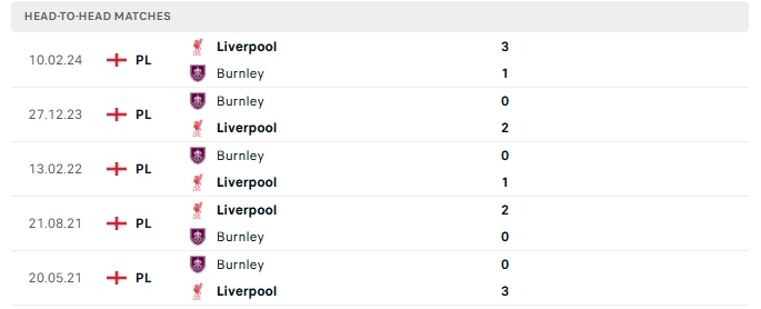 Lịch sử đối đầu của Burnley vs Liverpool