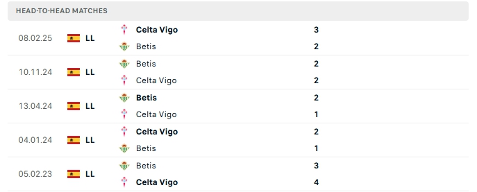 Những màn đụng độ giữa Celta Vigo và Betis thường diễn ra hấp dẫn với nhiều bàn thắng được tạo ra, cụ thể ở cả 5 lần gặp nhau gần nhất của hai đội và 3/5 lần đón tiếp Betis trên sân của Celta Vigo khép lại trên 3 bàn.