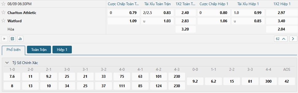 Bảng tỷ lệ kèo bóng đá trận đấu Charlton Athletic vs Watford