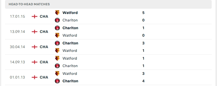 Những màn đụng độ giữa Charlton Athletic và Watford thường diễn ra hấp dẫn với nhiều bàn thắng được tạo ra,3/5 lần gặp nhau gần nhất của hai đội và 4/5 lần đón tiếp Watford trên sân của Charlton Athletic khép lại trên 3 bàn.