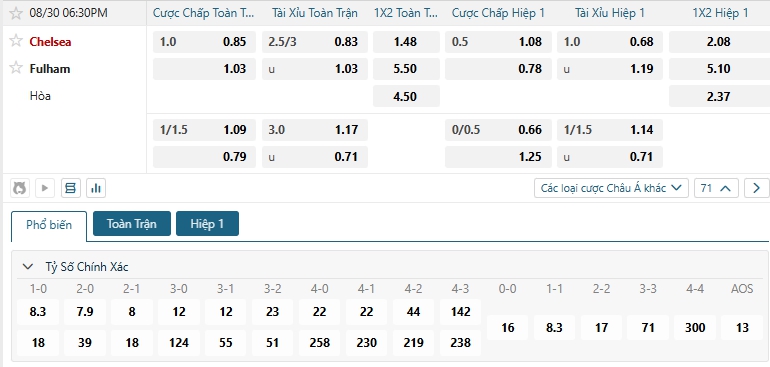 Nhà cái châu Á đang đánh giá cao khả năng chiến thắng của chủ nhà Chelsea, khi đưa ra mức chấp đang là 1.0, được thi đấu trên sân nhà và sở hữu phong độ cùng thực lực cao, The Blues được đánh giá cao hơn và sẻ hướng đến chiến thắng cho mình, Fulham dù sở hữu lối chơi khó chịu, sẻ đem đến nhiều khó khăn cho Chelsea, dù vậy họ khó lòng có được kết quả tốt khi ra về, lựa chọn Chelsea cho kèo Châu Á.