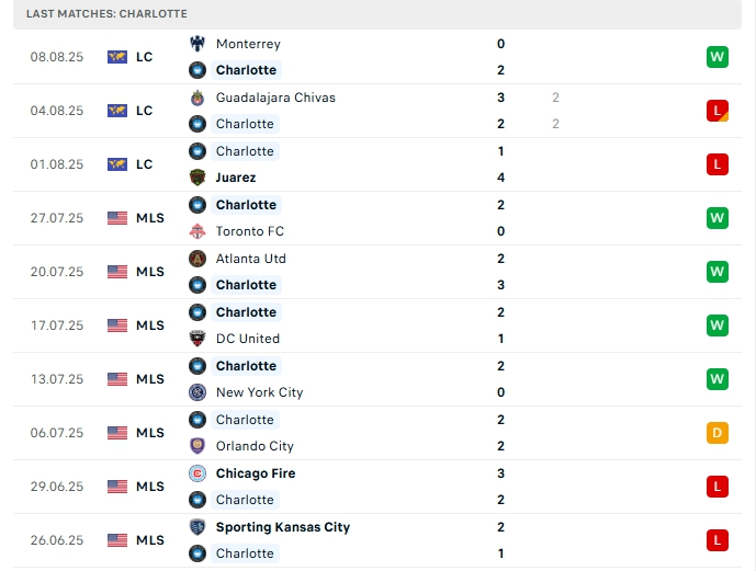 Bên kia sân, Charlotte cũng đang có được phong độ ấn tượng ở đấu trường MLS, họ bất bại ở 5 trận gần nhất với 4 chiến thắng và 1 hòa, sau 25 trận đấu, Charlotte có cho mình 12 chiến thắng, 2 hòa và 11 thất bại, có được 38 điểm và đang xếp vị trí thứ 7 trên BXH, dù vậy khi thi đấu xa nhà Charlotte đang chơi tệ khi chỉ thắng 3, hòa 1 và thua đến 9 trận sau 13 trận đấu.