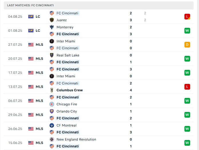 Phong độ gần đây Cincinnati vs Charlotte FC