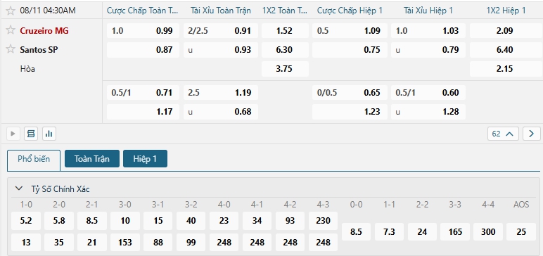 Bảng tỷ lệ kèo bóng đá trận đấu Cruzeiro vs Santos