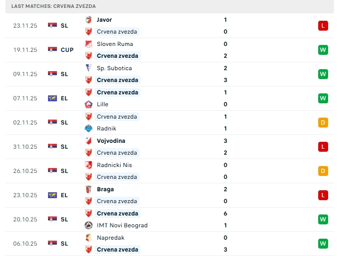 Crvena Zvezda sau 4 lượt trận đại diện Serbia có được 3 bàn thắng trong đó hàng thủ nhận 5 bàn thua, 3/4 trận đấu đó khép lại không quá 2 bàn thắng, trên sân nhà của mình ở 3/5 trận vừa qua khép lại không quá 2 bàn.