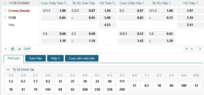 Bảng tỷ lệ kèo bóng đá trận đấu Crvena Zvezda vs Steaua Bucuresti