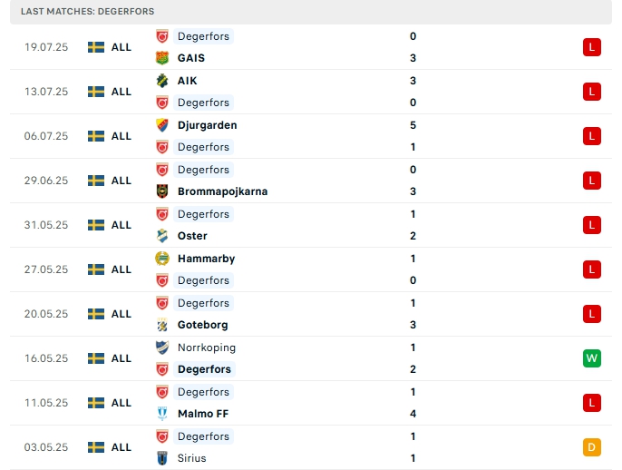 Degerfors sau 16 lượt trận họ mang về 4 chiến thắng, 1 hòa và nhận đến 11 thất bại có được 13 điểm và đang xếp vị trí thứ 14 trên BXH, Degerfors đang có phong độ không tốt, họ trải qua chuỗi 7 thất bại liên tiếp, trên sân nhà của mình Degerfors cũng chơi tệ khi thắng 1, hòa 1 và thua 6 sau 8 trận đấu, và đang là đội bóng có thành tích sân nhà tệ nhất tính đến thời điểm hiện tại.