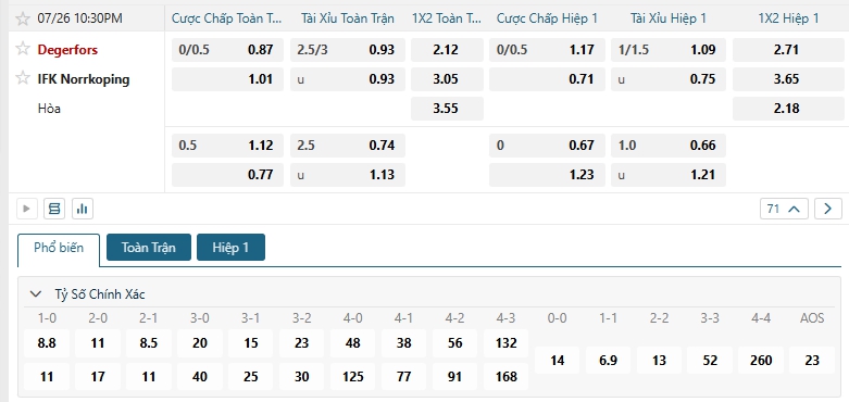Bảng tỷ lệ kèo bóng đá trận đấu Degerfors IF vs Norrkoping