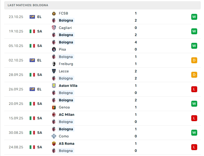 Bên kia sân, Bologna sau 7 trận đấu, đội bóng này mang về 4 chiến thắng, 1 hòa cùng 2 thất bại, có được 13 điểm và đang xếp vị trí thứ 5 trên BXH, Bologna vừa có chiến thắng trước FCSB ở đấu trường Europa League, đây là trận bất bại thứ 5 liên tiếp với 3 chiến thắng cùng 2 hòa, khi thi đấu xa nhà Bologna cũng có được 2 chiến thắng, 1 hòa ở 3 trận gần nhất.