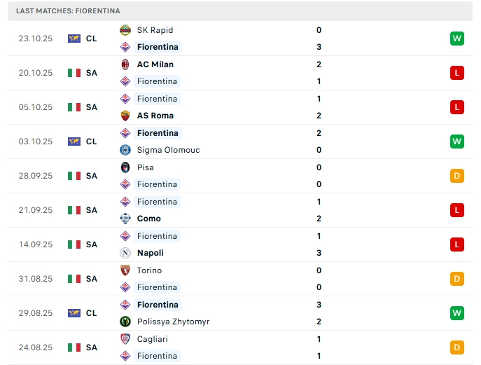 Fiorentina sau 7 trận đấu họ mang về 3 điểm cùng vị trí thứ 19 trên BXH, với 3 hòa và 4 thất bại, dù vừa có chiến thắng 3-0 trước SK Rapid ở đấu trường Conference League, nhưng trước đó Fiorentina trải qua 2 thất bại liên tiếp ở đấu trường Serie A, phong độ thời gian qua của Fiorentina là không tốt, trên sân nhà Fiorentina cũng đang chơi tệ khi toàn thua cả 3 trận.