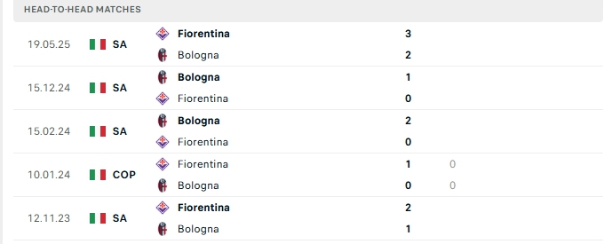 Những màn đụng độ giữa Fiorentina và Bologna thường diễn ra hấp dẫn với nhiều bàn thắng được tạo ra, trên sân nhà của mình ở 5 lần đón tiếp Bologna thì có 3 lần khép lại 90 phút trên 3 bàn.
