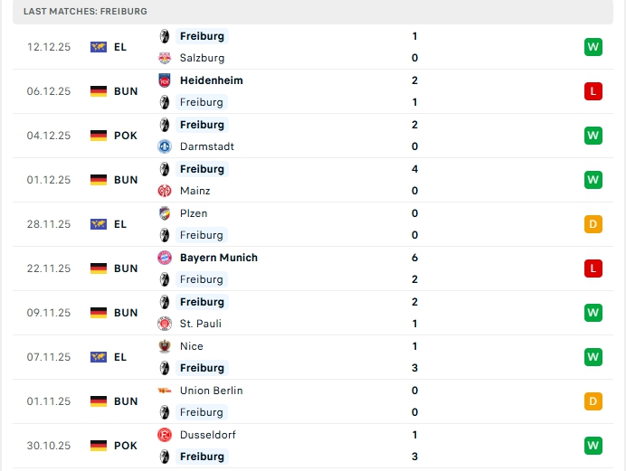 Freiburg sau 13 vòng đấu, đội bóng này mang về 4 chiến thắng, 4 hòa cùng 5 thất bại, có được 16 điểm và đang xếp vị trí thứ 9 trên BXH, ở vòng đấu gần nhất Freiburg nhận thất bại 1-2 trước Heidenheim, dù vậy đây chỉ là thất bại đầu tiên ở 5 trận gần nhất, trong đó có 3 chiến thắng, 1 hòa, trên sân nhà ở Freiburg đang chơi cực kỳ ấn tượng với 5 chiến thắng liên tiếp vừa qua và đang có chuỗi 11 trận bất bại liên tiếp.