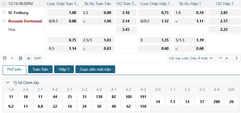 Bảng tỷ lệ kèo bóng đá trận đấu Freiburg vs Dortmund