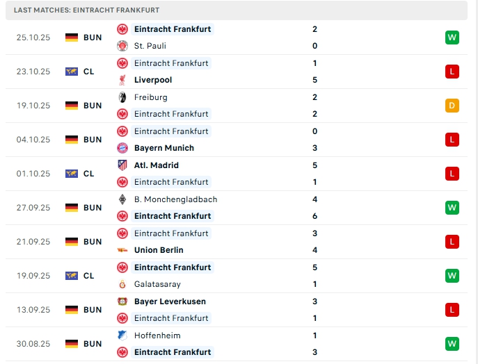 Frankfurt sau 8 vòng đấu họ mang về 21 bàn thắng cùng hàng thủ nhận 18 bàn thua, lối chơi của Frankfurt đang cực kỳ cởi mở, 4/5 trận gần nhất của Frankfurt khép lại trên 4 bàn thắng, trong đó khi xa nhà ở cả 5 trận vừa qua đều vượt mốc trên 4 bàn.