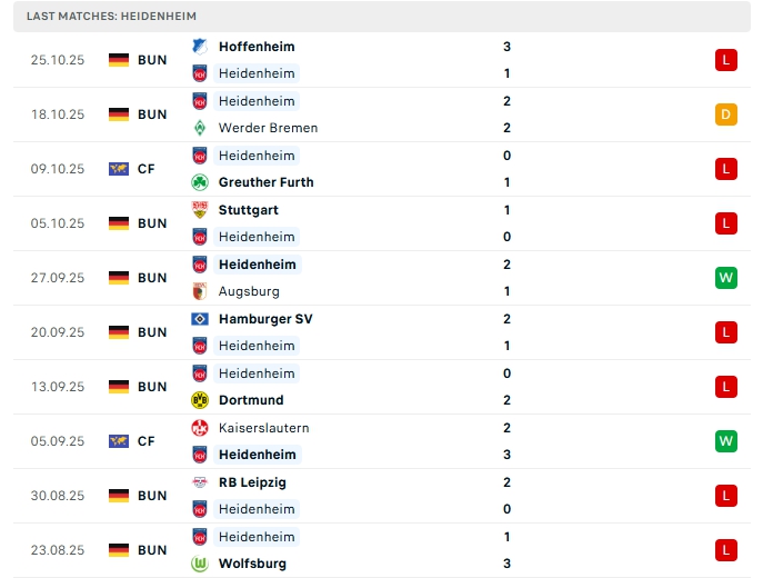 Heidenheim sau 8 trận đấu, đội bóng này mang về 1 chiến thắng, 1 hòa cùng 6 thất bại, có được 4 điểm và đang xếp vị trí thứ 17 trên BXH, một vị trí trong nhóm cầm đèn đỏ, phong độ thời gian qua của Heidenheim là không tốt, ở vòng gần nhất họ nhận thất bại đậm 1-3 trước Hoffenheim, đây là trận không thắng thứ 4 liên tiếp của đội bóng này, trên sân nhà Heidenheim cũng chơi tệ khi thua 3, hòa 1 và chỉ thắng 1 ở 5 trận gần nhất.