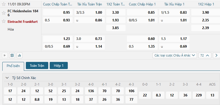 Bảng tỷ lệ kèo bóng đá trận đấu Heidenheim vs Frankfurt