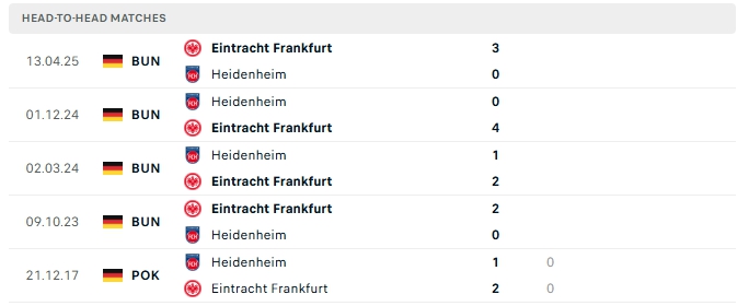 Lịch sử đối đầu của Heidenheim vs Frankfurt