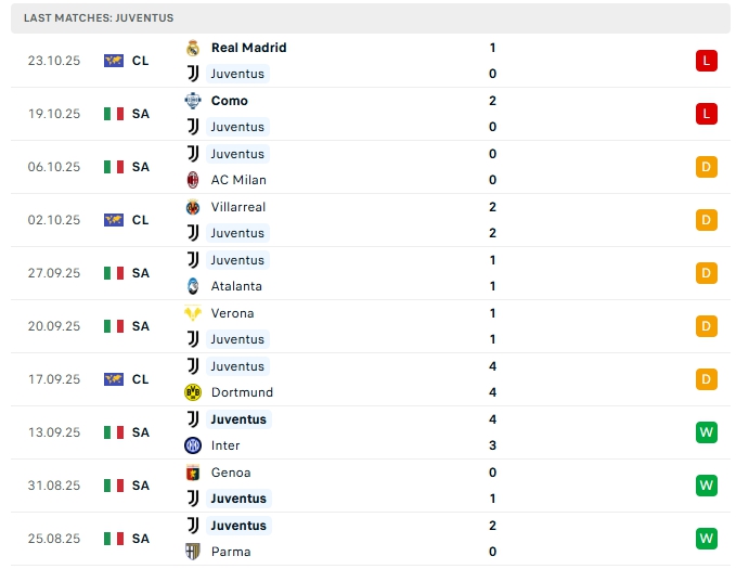 Juventus  sau 7 trận đấu này, đội bóng này mang về 9 bàn thắng cùng hàng thủ nhận 7 bàn thua, 4/5 trận gần nhất của Juventus ít hơn 2 lần lưới rung, lối chơi của Juventus đang thiện về sự chắc chắn nơi hàng thủ, khi xa nhà ở 4/5 trận vừa qua cũng có kết quả tương tự.
